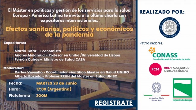El ciclo de charlas terminó con el encuentro “Efectos Sanitarios, políticos y económicos de la pandemia” junto con Chiara Gibertoni, Direttore generale Policlinico Sant’Orsola-Malpighi de Bologna, Martín Tetaz, profesor y economista, Andrés Malamud, profesor en Unibo y en la Universidad de Lisboa y Fernán Quirós, Ministro de Salud de la Ciudad de Buenos Aires. El dr. Carlos Vassallo fue moderador de este último encuentro. LINK VIDEO